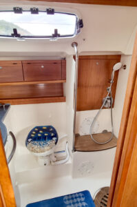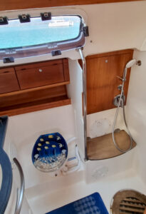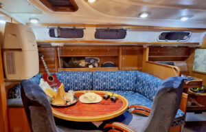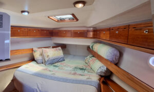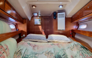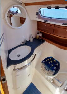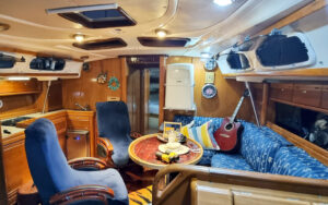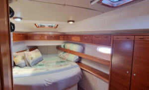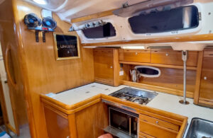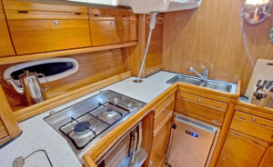 На борту яхты расположено 4 каюты, однако для ночного размещения доступны только 3, вмещающие 6 человек. Широкий кокпит с сиденьями из тикового дерева, накрытый тентом, складной стол и защита от брызг создают идеальную обстановку для отдыха на свежем воздухе. Сертификация CE (A) подтверждает готовность этой яхты к выходам в открытое море.