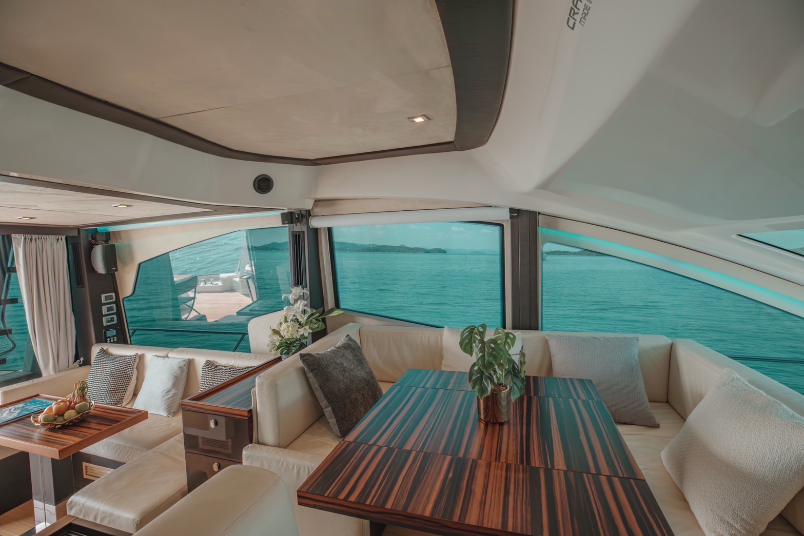 Моторная яхта Cranchi 58 – это стильное и комфортное судно, готовое для приватного однодневного чартера вокруг Пхукета. На борту предусмотрено много развлечений: оборудование для сноркелинга и рыбалки, ватрушка, падлборд, гидравлическая платформа для купания, один Jet Ski, водный бассейн, полотенца, Indoor & Outdoor звуковая система и динги — всё для активного и расслабленного отдыха на море.