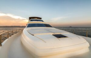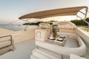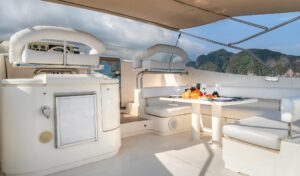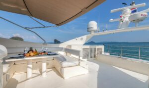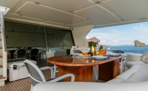 Экстерьер яхты обладает функциональностью и щедростью. Кормовая палуба, расположенная рядом с салоном, предлагает стол для уличных обедов, сиденья, частичную тень, бар и доступ к верхней палубе. Главная палуба, охватывающая всю длину яхты и ведущая на носовую палубу. На верхней палубе флайбридж – гости могут наслаждаться уличным обедом, сиденьями, баром и открытым для солнца пространством. Для активного времяпрепровождения имеется выбор водных развлечений. Яхта предоставляет разнообразные возможности для активного и расслабляющего отдыха, обеспечивая высокий уровень сервиса и комфорта.