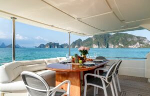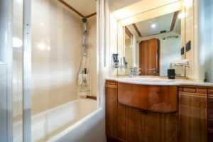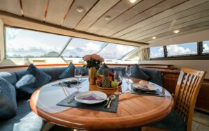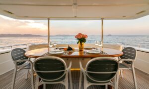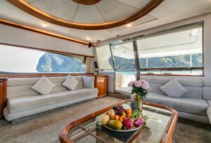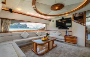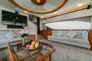 Эта яхта для представляет собой воплощение современности и элегантности в дизайне интерьера. Изысканные панели теплого красного дерева, нейтральная обивка мягкой мебели и легкая воздушная атмосфера создают уникальное пространство. Просторный салон с обширным диваном, противостоящим креслом, журнальным столиком и современной системой развлечений приглашает к отдыху. Окна салона наполняют помещение естественным светом. На поднятом уровне перед салоном расположен формальный обеденный стол, способный легко вместить 8 гостей.