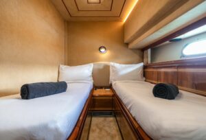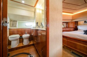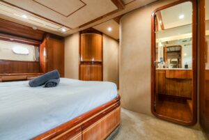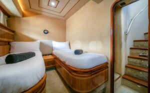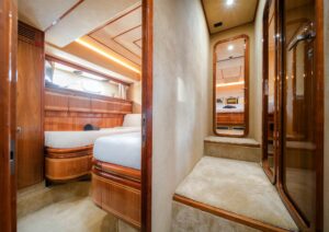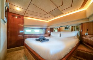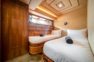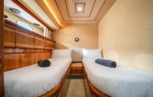 Внизу находятся 4 гостевые каюты, обеспечивающие проживание до 8 человек. Мастер-каюта, занимающая всю ширину яхты по середине, предлагает центральную кровать king size, диван и туалетный столик, а её ванная комната обставлена со вкусом и оснащена ванной. VIP-каюта расположена в передней части и охватывает всю ширину яхты с центральной кроватью queen size. Две гостевые каюты оснащены двумя односпальными кроватями. Мастер и VIP-каюты предлагают частные ванные комнаты, аудио и телевизионное развлечение. В Twin каютах общие удобства и аудио-развлечения. Яхта полностью кондиционирована, обеспечивая максимальный комфорт.