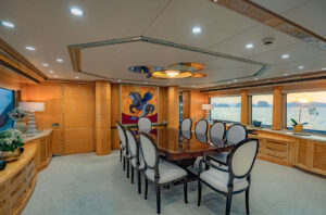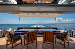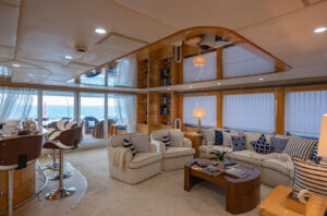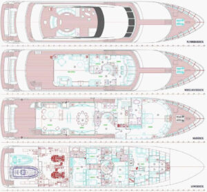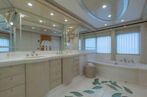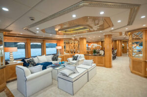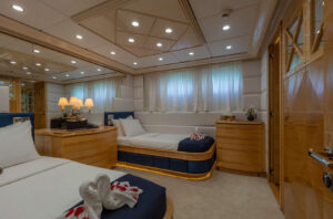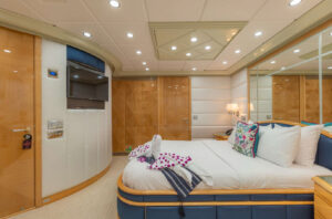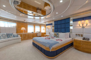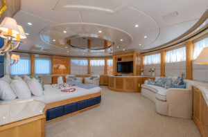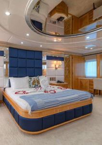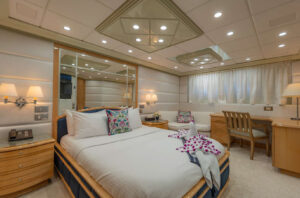 Дизайн яхты, разработанный Omega Architects и Paola D. Smith & Associates, выражает собой современную элегантность и функциональность. На борту расположено пять кают, включая просторную каюту владельца и две VIP-каюты, каждая из которых обеспечивает исключительный комфорт и уединение, благодаря собственным ванным комнатам.