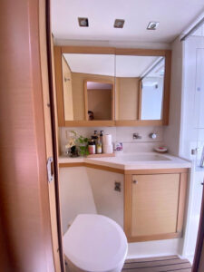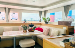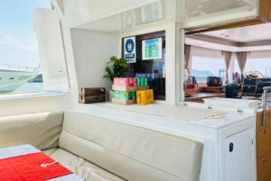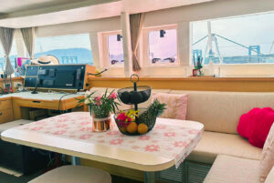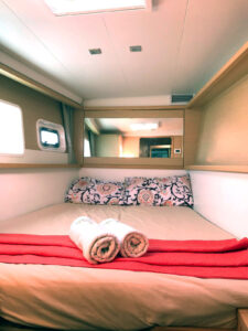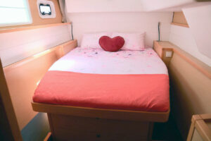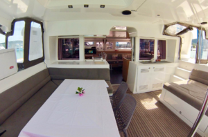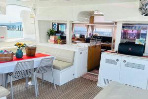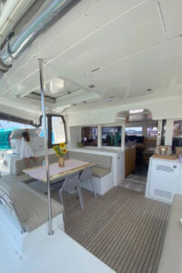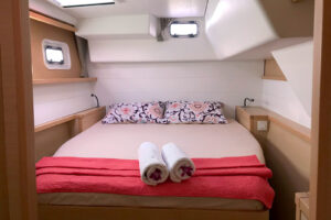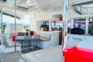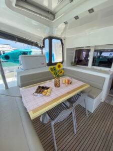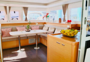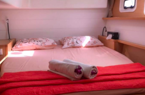 Катамаран Lagoon 450 отличается просторной площадью для отдыха, благодаря чему на борту созданы впечатляющие условия для комфортного пребывания. Кокпит, где может собраться вся компания, объединен с салоном широким проходом. На носовой части расположена лаундж-зона с местом для загара и сеткой, а также флайбридж с постом управления и просторным лежаком для загара. Яхта оснащена 4 роскошными каютами с двуспальными кроватями, позволяя принимать до 8 гостей во время ночного чартера.