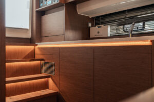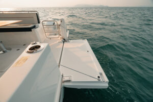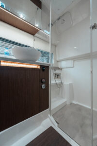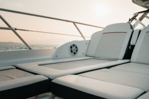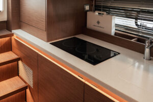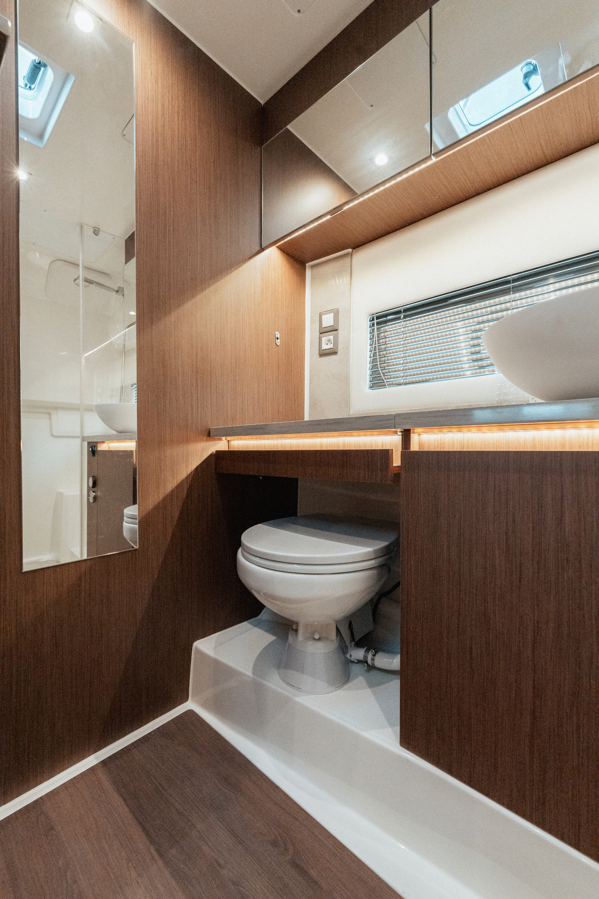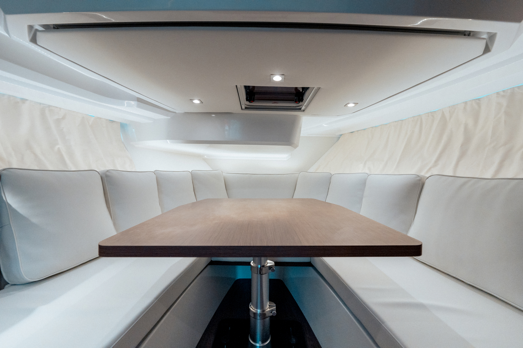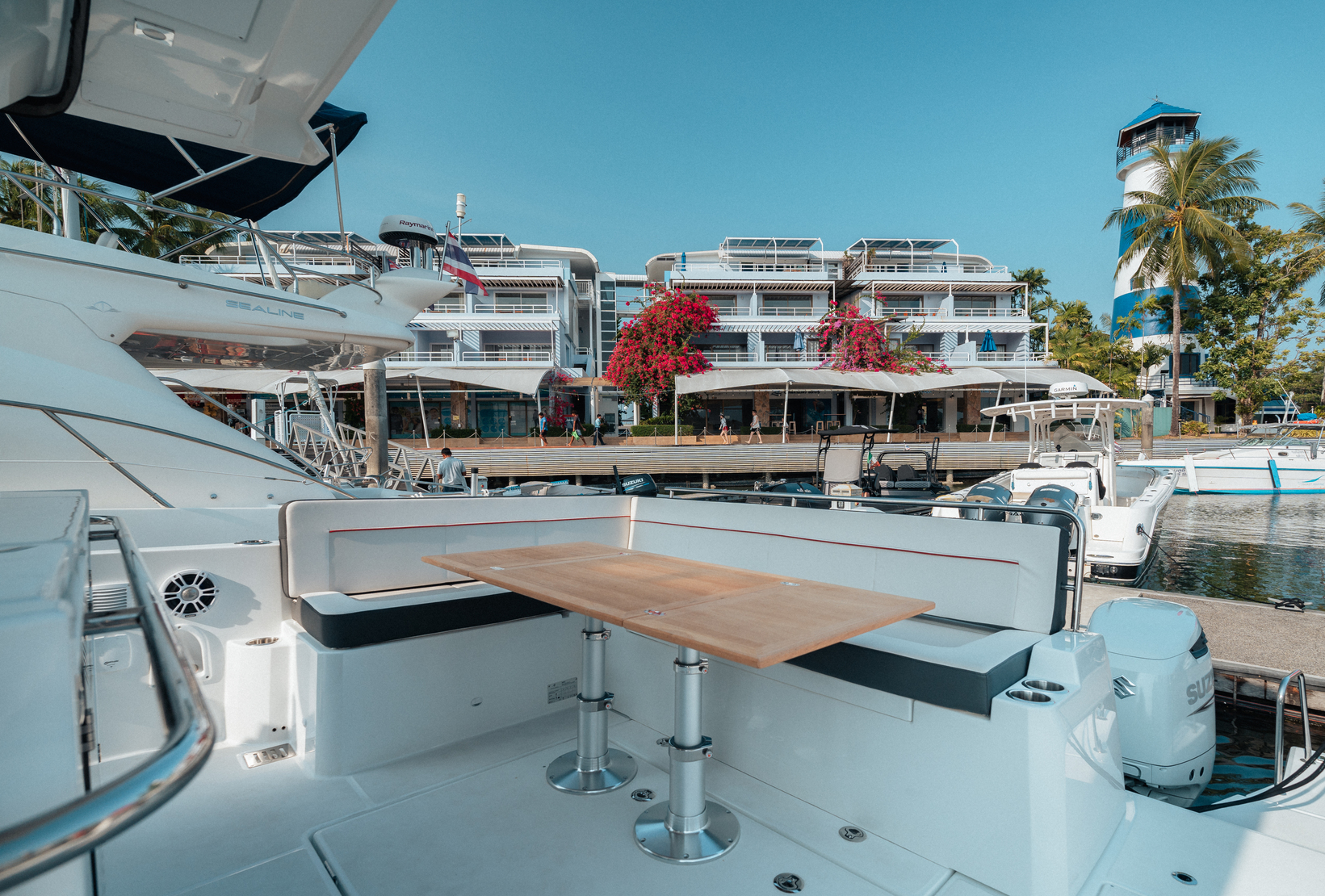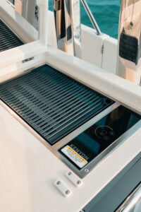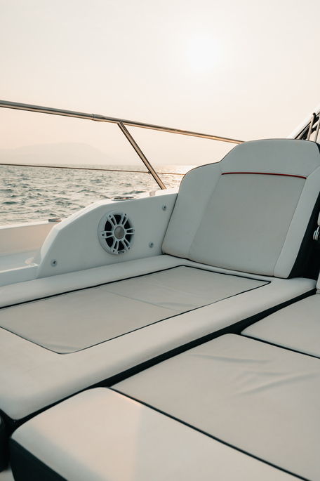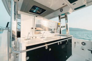 На борту есть все базовые удобства: кондиционер, генератор, кухня внутри и компактная зона для завтраков с плитой и грилем на свежем воздухе. Также есть холодильник, микроволновка и кофемашина, аудиосистема и розетки 220В. Дополнительный комфорт создаёт откидная терраса на корме — удобно для купания и отдыха у воды.