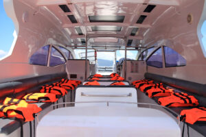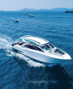 Orion ’42 – это мощный трехмоторный катер имеет длину 12,8 метров и развивает скорость до 32 узлов. Катер предлагает комфортное размещение для большой компании до 40 человек, что делает его идеальным выбором для групповых поездок. На борту вы найдете мягкие сидения, удобный туалет и специальный спуск в воду для безопасного и комфортного купания.