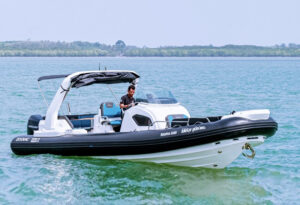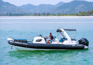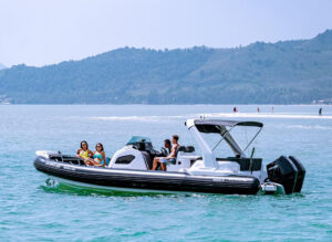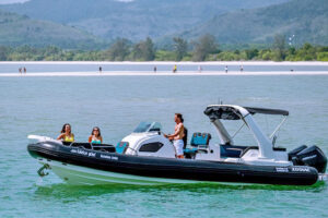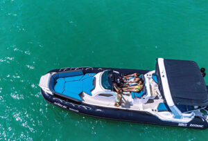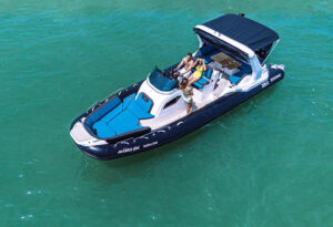 Длиной 8,9 метра и шириной 3,06 метра, этот катер обеспечивает достаточно места для вашей группы. Он оснащен двумя подвесными четырехтактными двигателями Mercury Verado объемом 250 лошадиных сил каждый, обеспечивая круизную скорость до 20 узлов. На борту вы найдете всё необходимое для комфортного путешествия: бимини для защиты от солнца, мини-кухню, раковину, холодильник, душ, платформу для плавания и специальный спуск в воду, обеспечивающий максимальное удобство.